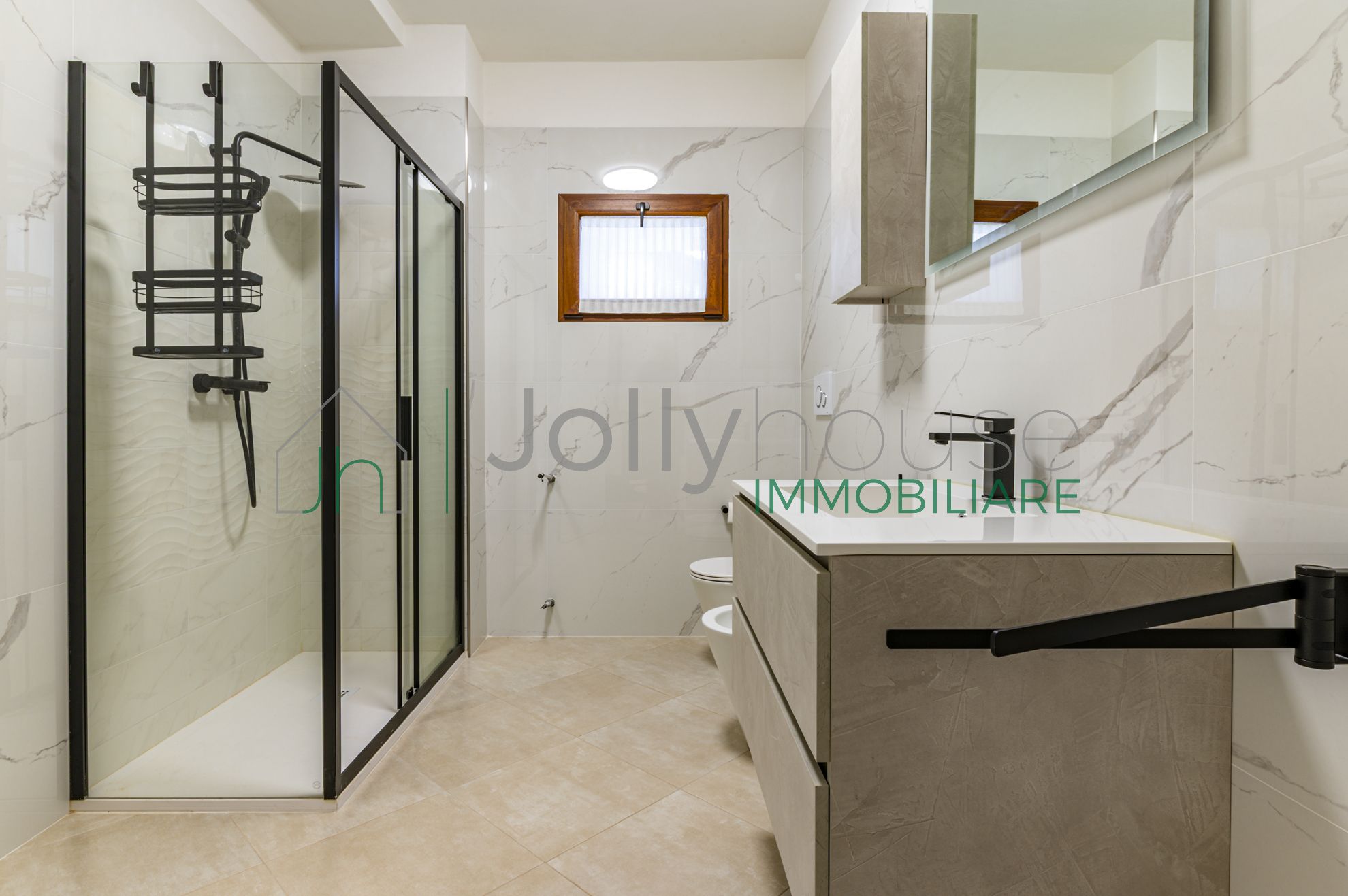Il bagno è moderno, finestrato e dotato di un grande box doccia.