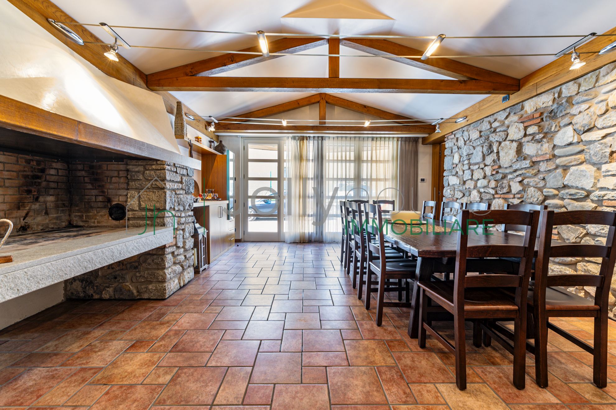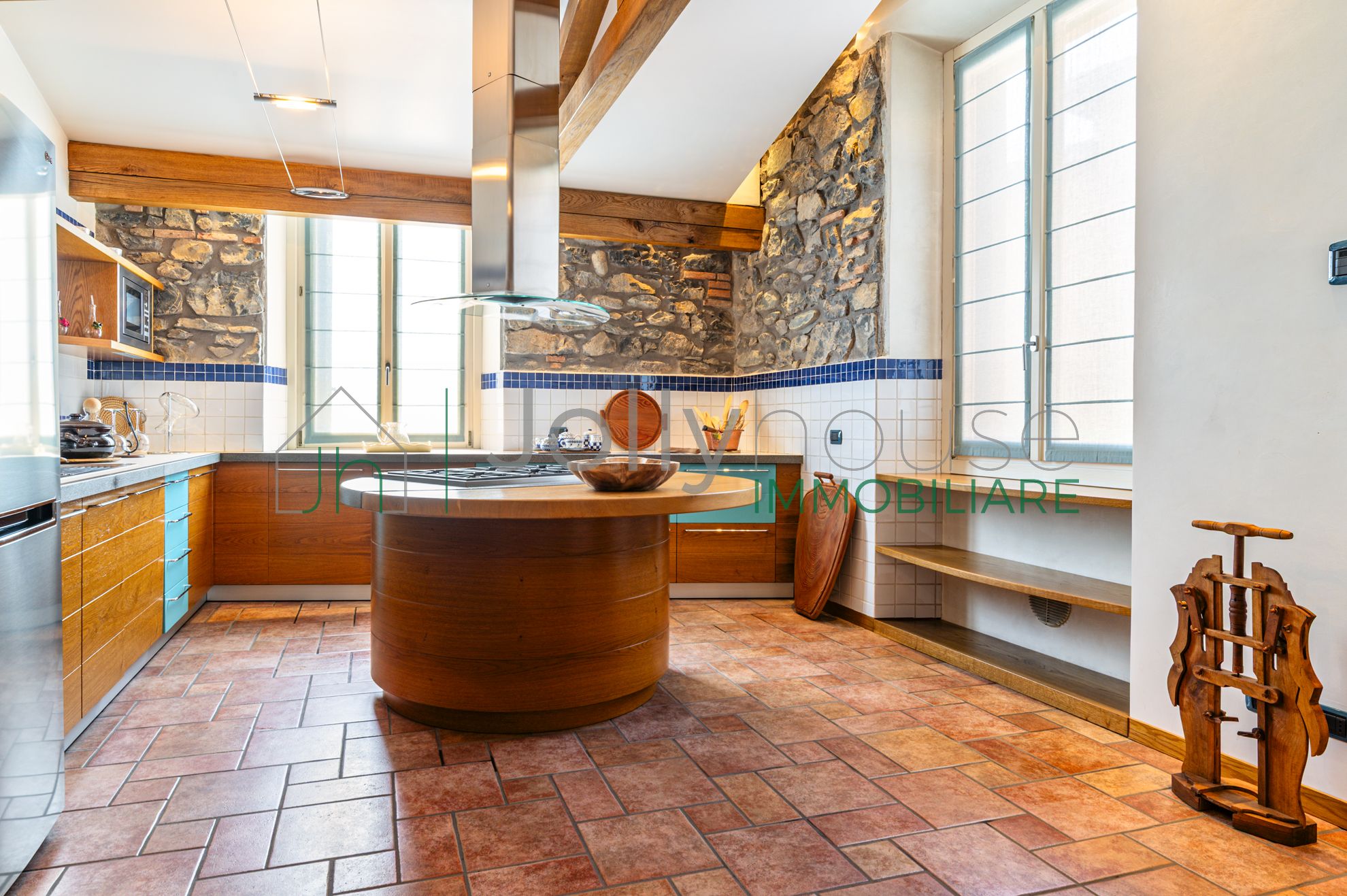 Il punto focale dell’ambiente è lo splendido camino bifacciale, un elemento architettonico che separa la zona giorno dalla cucina. La cucina è semi-separata e dominata da una grande isola centrale, ideale per chi ama cucinare e ospitare.