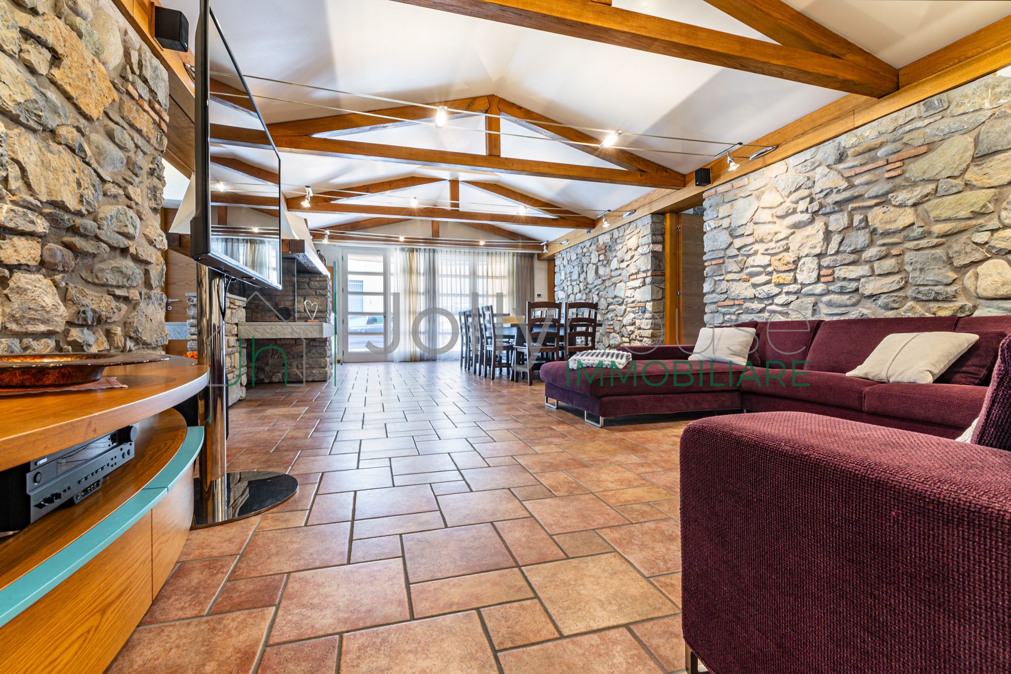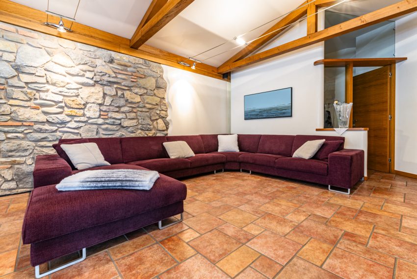 Pareti in pietra naturale e travi in legno a vista.