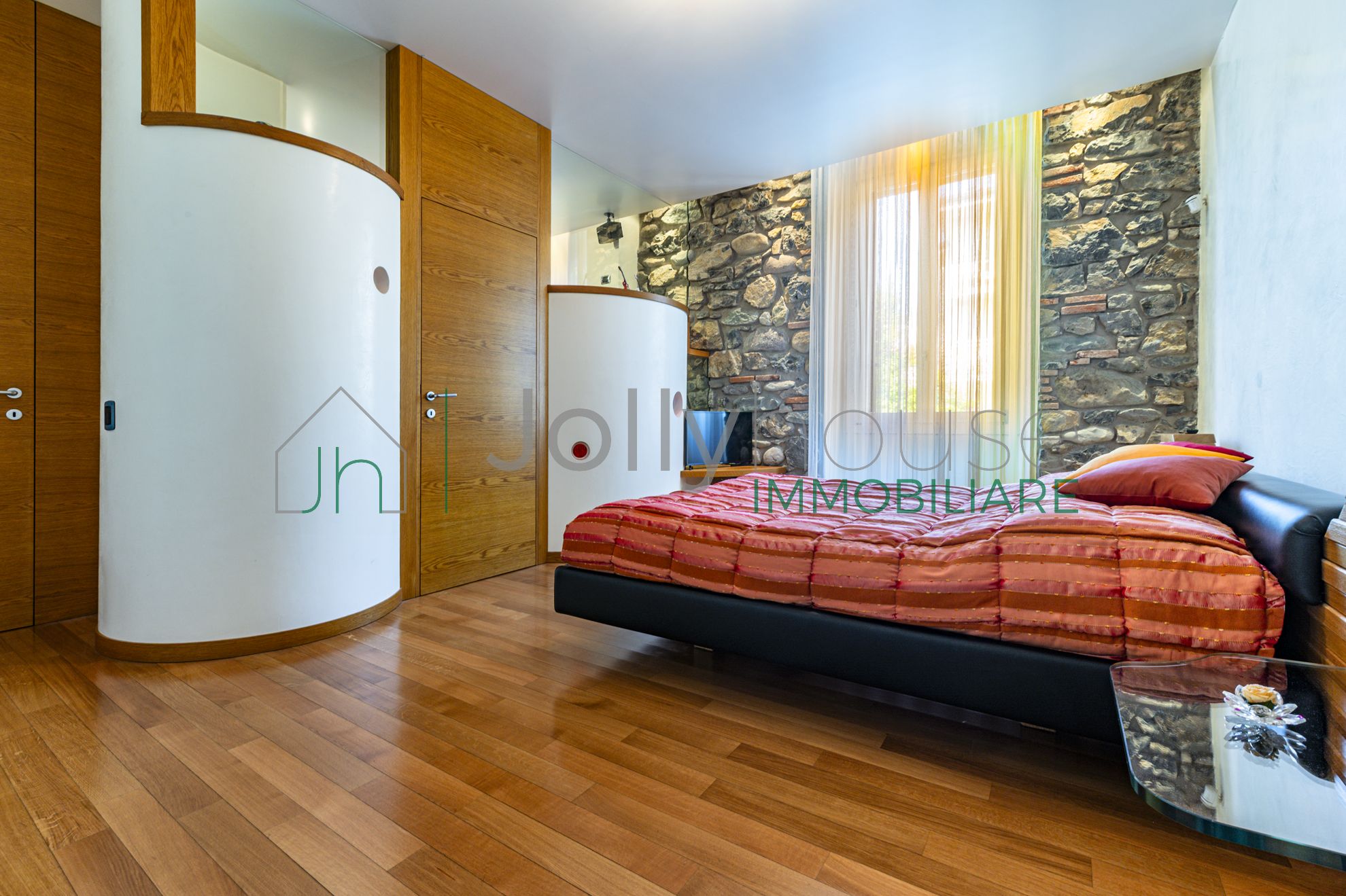 La cabina armadio è di tipo “passante”, collegando direttamente le due camere per la massima praticità.